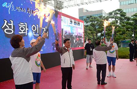 4일 오전 울산시청 햇빛광장에서 열린 제103회 전국체전 성화 합화식 및 공식 봉송 출발식에서 김두겸 울산시장, 김기환 시의회 의장, 노옥희 교육감이 강화도 마니산에서 채화한 성화를 첫 주자에게 인계식을 갖고 있다. 2022.10.04.
