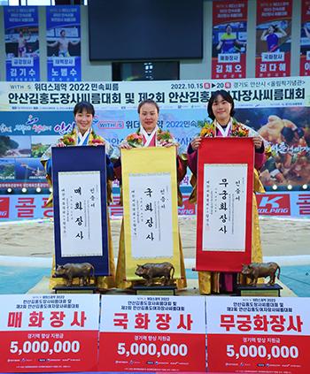 양윤서(영동군청), 엄하진(구례군청), 이다현(거제군청)이 위더스제약 2022 민속씨름 안산 김홍도장사씨름대회 및 제2회 안산 김홍도 여자장사씨름대회에서 장사에 등극했다.