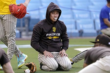 샌디에이고 파드리스의 김하성이 10일(현지시간) 미 캘리포니아주 로스앤젤레스의 다저 스타디움에서 11일 열리는 2022 메이저리그 내셔널리그 디비전시리즈(NLDS·5전3승제) LA 다저스와의 1차전을 앞두고 몸을 풀고 있다. 2022.10.11.