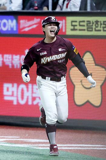 1일 인천 SSG랜더스필드에서 열린 2022 KBO 한국시리즈 1차전 키움 히어로즈와 SSG 랜더스의 경기, 9회초 1사 2루 대타로 나선 키움 전병우가 역전 투런 홈런을 때리고 홈인, 더그아웃으로 들어가며 기뻐하고 있다. 2022.11.01.