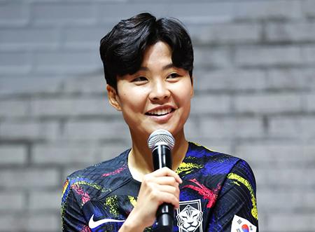 한국 여자축구 대표팀 지소연(수원 FC)이 19일 서울시 강남구 나이키 써클81에서 열린 2022 대한민국 축구 국가대표팀 유니폼 공개 행사에 참석하고 있다. (사진=나이키 제공) 2022.09.19