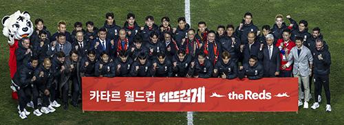 11일 오후 경기 화성종합경기타운에서 열린 하나은행 초청 축구 국가대표 평가전 대한민국과 아이슬란드의 경기를 마친 뒤 열린 대한민국 선수들이 월드컵 출정식에서 기념촬영을 하고 있다. 2022.11.11.
