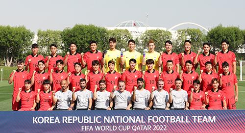 대한민국 축구대표팀 파울루 벤투 감독 및 선수단과 27번째 멤버로 합류한 오현규 등이 16일(현지시간) 오전 카타르 도하 알 에글라 트레이닝센터에서 단체사진 촬영을 하고 있다. 2022.11.16.