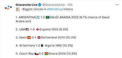 그레이스노트가 \'역대 월드컵 최대 이변\' 확률을 계산했다. 2022.11.23. (사진=그레이스노트 트위터 캡처)