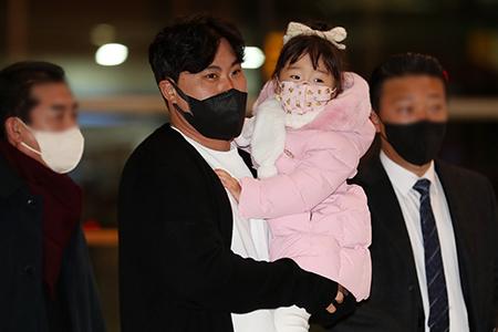 팔꿈치 수술 후 재활 중인 류현진(35·토론토 블루제이스)이 29일 오전 인천국제공항 제2여객터미널에서 딸과 함께 이동하고 있다. 2022.12.29.