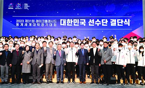 4일 서울 송파구 올림픽파크텔 올림피아홀에서 \'2023 제31회 레이크 플래시드 동계세계대학경기대회(동계유니버시아드) 대한민국 선수단 결단식\'이 열렸다.
