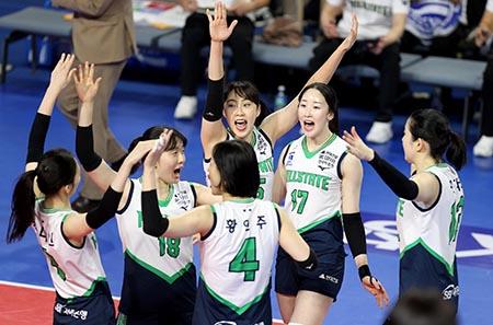 1일 경기 화성시 실내체육관에서 열린 도드람 2022-2023 V리그 현대건설과 기업은행의 경기에서 현대건설 선수들이 환호하고 있다. (사진=현대건설 배구단 제공) 2023.01.01.