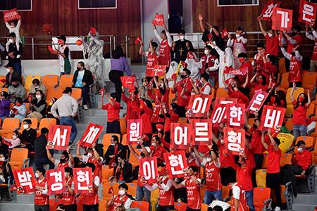 28일 오후 광주 서구 염주종합체육관에서 열린 2022-2023 도드람 V리그 페퍼저축은행 AI페퍼스와 현대건설 힐스테이트의 경기, AI페퍼스 응원단이 환호하고 있다. 2022.10.28