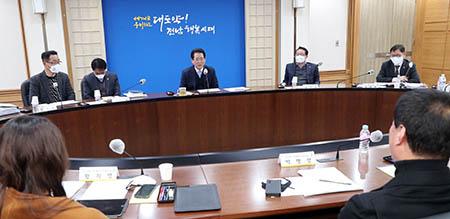 김영록 전남도지사(가운데)가 26일 오후 도청 정약용실에서 오는 10월과 11월 개최되는 \'제104회 전국체전\'과 \'제43회 전국장애인체전\'의 개·폐회식 연출 기본방향 보고회를 주재하고 있다. (사진=전남도 제공) 2023.01.26.