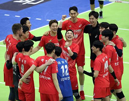 19일 오후 경기 수원 수원실내체육관에서 열린 2022~2023 V-리그 남자부 한국전력과 삼성화재의 경기, 세트스코어 3-2로 승리한 한국전력 선수들이 기뻐하고 있다. 2023.02.19.