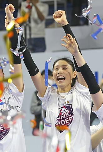 15일 오후 경기도 화성시 화성종합실내체육관에서 열린 2022~2023 V-리그 여자부 정규리그 1위 시상식에서 흥국생명 김연경이 정규리그 1위 수상에 기뻐하고 있다. 2023.03.15.