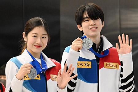 국제빙상연맹 남녀 피겨스케이팅 세계선수권대회에서 은메달을 획득한 차준환(오른쪽), 이해인이 27일 서울 강서구 김포국제공항을 통해 귀국 후 메달을 들고 포즈를 취하고 있다. (공동취재사진) 2023.03.27.