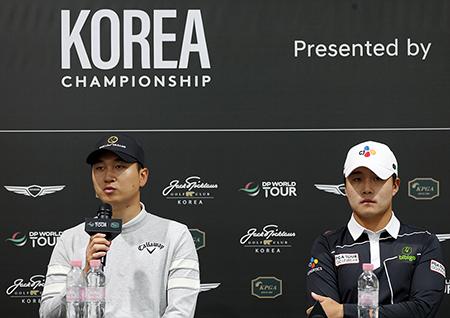 DP월드투어 코리아 챔피언십 기자회견에 나선 왕정훈과 김민규. (사진=KPGA 투어 제공)