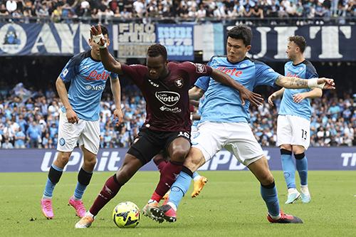 나폴리의 김민재(오른쪽)가 지난달 30일(현지시간) 이탈리아 나폴리의 디에고 아르만도 마라도나 경기장에서 열린 2022~23 세리에 A 축구 32라운드 셀레르니타나와의 경기 중 공을 다투고 있다. 2023.05.01.