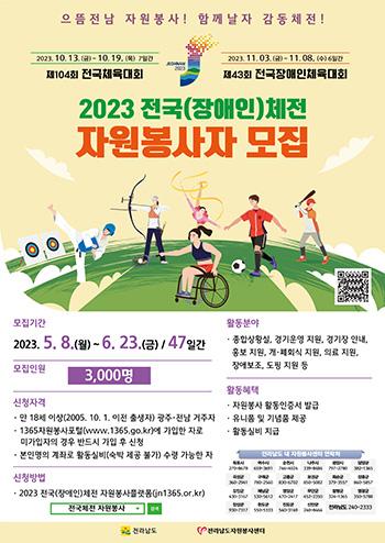 전남도가 \'으뜸전남 자원봉사! 함께 날자 감동체전\'이라는 주제로 \'104회 전국체전\'과 \'제43회 전국장애인체전\' 성공 개최를 뒷받침할 자원봉사자를 모집한다.