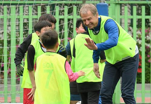위르겐 클린스만 한국 축구대표팀 감독이 28일 오후 인천 서구 발산초등학교에서 어린이들과 함께 축구를 하고 있다. 이날 교육부와 대한축구 협회는 ‘학교체육 활성화 및 늘봄 학교지원을 위한 업무협약을 맺었다. 2023.04.28.