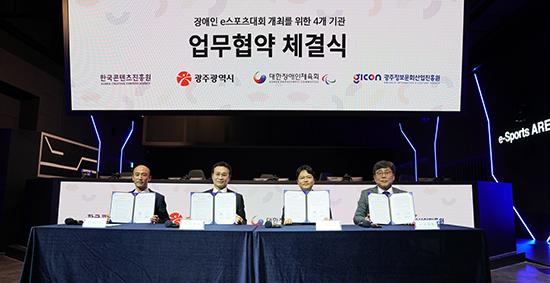 광주시는 한국콘텐츠진흥원, 대한장애인체육회, 광주정보문화산업진흥원과 함께 ‘장애인 이스포츠 대회’ 개최를 위한 업무협약을 5월 31일 광주 이스포츠경기장에서 체결했다.