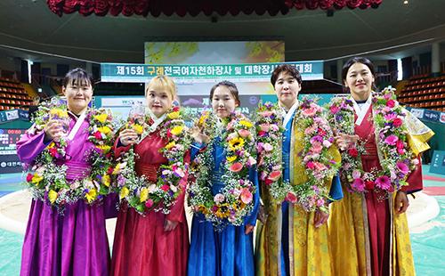 \'제15회 구례전국여자천하장사 및 대학 장사씨름대회\' 우승자들, 매화급 우승 구례군청 김시우(오른쪽 두번째). /구례군 제공