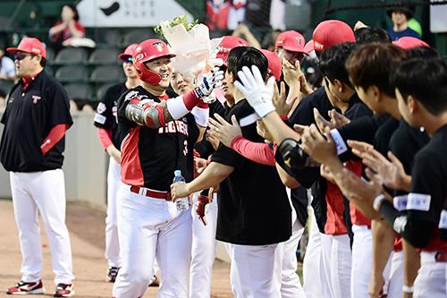 KIA 타이거즈 최형우가 20일 대전 한화생명이글스파크에서 열린 KIA 타이거즈와 한화 이글스의 경기, 4회초 1사 1루상황에서 가운데 담장을 넘기는 투런포를 쏘아 올리며 통산 1500타점 기록을 달성한 후 동료들과 기뻐하고 있다. 이날 경기 전까지 통산 1498타점으로 이승엽 두산 베어스 감독과 통산 타점 공동 선두를 달리던 최형우는 KBO 최초 1500타점 신기록을 작성했다. 2023.06.20. /KIA 타이거즈 제공