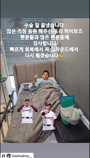 이정후는 \"수술 잘 끝냈습니다. 많은 걱정 응원해주신 팬분들께 감사합니다\"라며 \"빠르게 회복해서 꼭 그라운드에서 다시 뵙겠습니다\"라고 근황을 전했다.