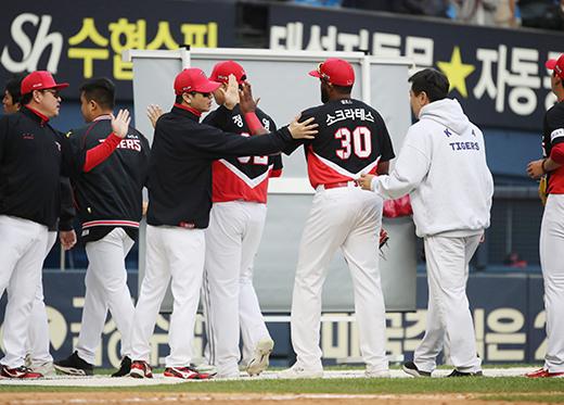 지난 4월 30일 서울 잠실야구장에서 열린 2023 KBO 리그 KIA 타이거즈 대 LG 트윈스 경기, 12대 8로 LG를 꺾은 KIA 선수들이 자축하고 있다. 김종국 감독과 소크라테스가 인사하고 있다. 2023.04.30