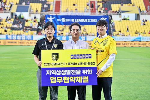 순천, 여수웅천, 광주첨단의 메가박스 영화관을 운영하는 법인 (유)씨네구백은 씨네패밀리 앱을 개발하여 다양한 서비스를 제공하여 지역 시민들의 문화생활을 선도하고 있다. (유)씨네구백은 전남드래곤즈 홈경기장 입장관중을 위해 다양한 경품을 후원하며 상호협력하기로 약속했다.