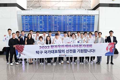 남녀 탁구 대표팀은 19일 인천국제공항에 집결해 아시안게임이 열리는 결전지 중국 항저우로 떠났다. 대표팀은 아시안게임 개막식을 하루 앞둔 22일부터 경기를 치른다.