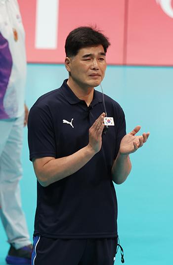 20일 중국 항저우 린핑 스타디움에서 열린 2022 항저우 아시안게임 남자 배구 조별리그 C조 1차전 대한민국 대 인도 경기, 한국 임도헌 감독이 박수를 치고 있다. 2023.09.20.