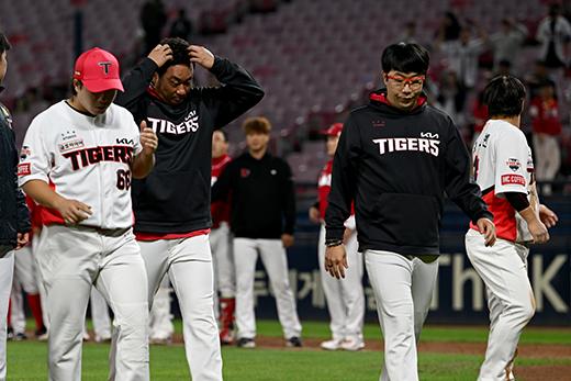 10일 오후 광주 북구 광주-기아챔피언스필드에서 열린 2023프로야구 KIA 타이거즈 대 SSG 랜더스의 경기, 6대 5로 한 점 차이로 진 KIA 선수들이 아쉬워하고 있다. 2023.10.10.