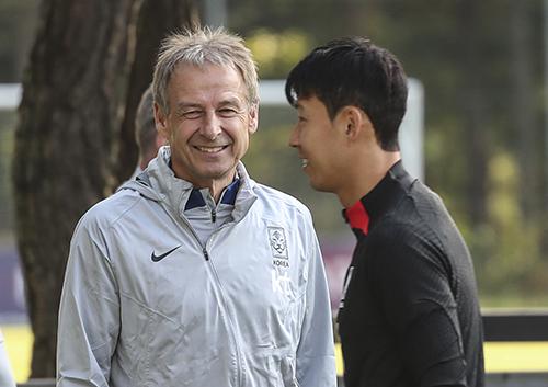 축구 국가대표팀 손흥민이 9일 경기 파주 축구국가대표트레이닝센터(NFC)에서 열린 축구 국가대표팀 훈련공개에서 위르겐 클린스만 감독과 이야기를 나누고 있다. 축구 국가대표팀은 오는 13일 서울에서 튀니지를 상대한 뒤 17일 수원에서 베트남과 친선경기를 치른다. 2023.10.09.