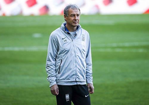 축구대표팀 위르겐 클린스만 감독이 16일 경기 수원월드컵경기장에서 베트남과의 평가전을 하루 앞두고 열린 훈련에서 선수들을 바라보고 있다. 2023.10.16.
