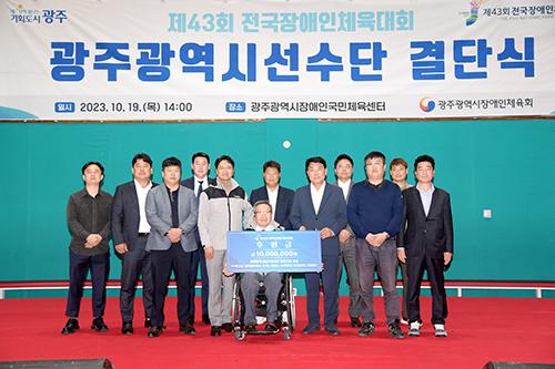 김광진 광주시 문화경제부시장이 19일 오후 광주시장애인국민체육센터에서 열린 제43회 전국장애인체육대회 선수단 결단식에 참석해 기관·기업체로부터 격려금을 전달 받은 후 기념촬영을 하고 있다. /광주시 제공