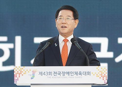 김영록 전라남도지사가 3일 오후 목포종합경기장에서 열린 제43회 전국장애인체육대회 개회식에서 환영사를 하고 있다. /전남도 제공