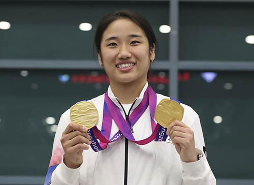 2022 항저우 아시안게임 대한민국 배드민턴 안세영 선수가 8일 인천국제공항 제1여객터미널 입국장 앞에서 열린 환영행사에서 금메달을 들어보이고 있다. 2023.10.08.