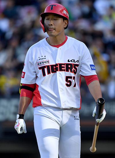 9일 오후 광주 북구 광주-기아챔피언스필드에서 열린 2023 프로야구 KIA타이거즈와 두산 베어스의 경기, 8회말 무1사에서 KIA 고종욱이 삼진 아웃당한 뒤 아쉬워하고 있다. 2023.04.09.