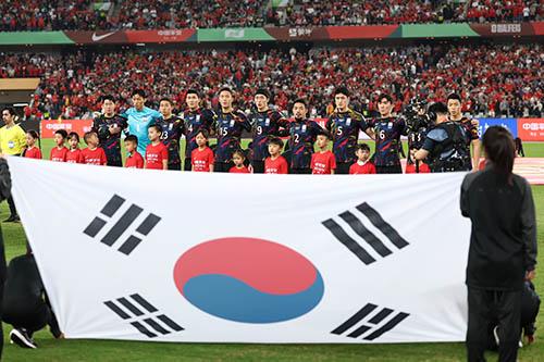 21일 중국 선전 유니버시아드 스포츠센터에서 열린 2026 북중미 월드컵 아시아 2차 예선 대한민국과 중국의 경기, 대표팀 선수들이 애국가를 부르고 있다. 2023.11.21.