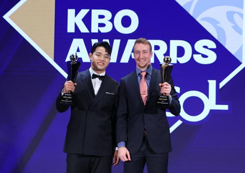 27일 서울 웨스틴조선호텔 서울에서 열린 2023 신한은행 SOL KBO 시상식에서 MVP NC 페디와 신인상 한화 문동주가 함께 기념촬영하고 있다. 2023.11.27.