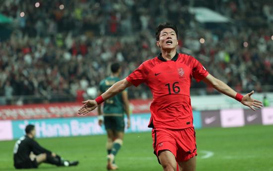 13일 오후 서울 마포구 서울월드컵경기장에서 열린 하나은행 초청 축구 국가대표 평가전 대한민국과 튀니지의 경기, 한국 황의조가 골을 넣고 기뻐하고 있다. 2023.10.13.
