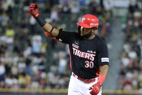 6일 서울 송파구 잠실야구장에서 열린 2023 프로야구 KIA 타이거즈 대 두산베어스의 경기, 4회 초 1사 주자 2,3루서 KIA 소크라테스가 2타점 적시타를 친 뒤 세리머니를 하고 있다. 2023.09.06.
