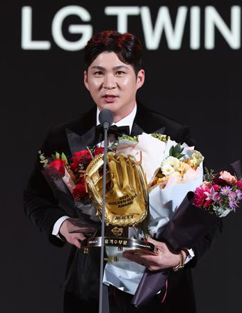 11일 오후 서울 강남구 코엑스 오디토리움에서 열린 2023 신한은행 SOL KBO 골든글러브 시상식에서 유격수 부문 골든글러브를 수상한 LG 오지환이 소감을 밝히고 있다. 2023.12.11.