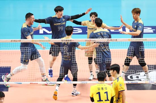 27일 오후 서울 중구 장충체육관에서 열린 2023-2024 V-리그 프로배구 남자부 KB손해보험과 우리카드의 경기, 우리카드 선수들이 득점 후 기뻐하고 있다. 2023.12.27.