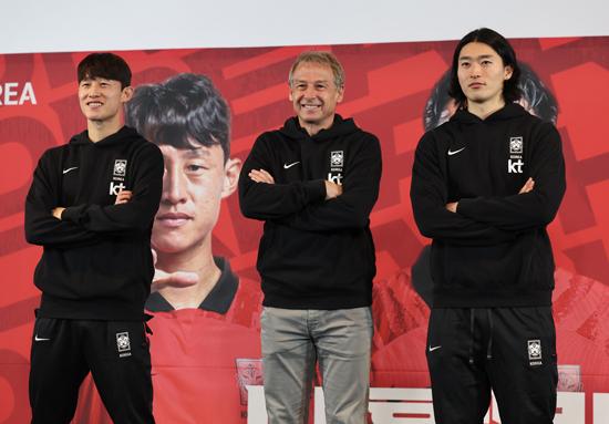 대한민국 축구 국가대표팀 이재성(왼쪽부터), 위르겐 클린스만 감독, 조규성이 28일 서울 용산구 CGV 아이파크몰에서 열린 2023 아시아축구연맹(AFC) 카타르 아시안컵 축구 국가대표팀 명단 발표식에서 포즈를 취하고 있다. 2023.12.28.