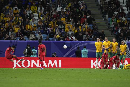 손흥민(왼쪽)이 2일(현지시각) 카타르 알와크라의 알자누브 스타디움에서 열린 2023 아시아축구연맹(AFC) 아시안컵 8강전 호주와의 경기 연장 전반 14분 프리킥으로 역전 골을 넣고 있다. 한국이 2-1로 힘겹게 승리하고 4강에 올라 요르단과 결승행을 다툰다. 2024.02.03.