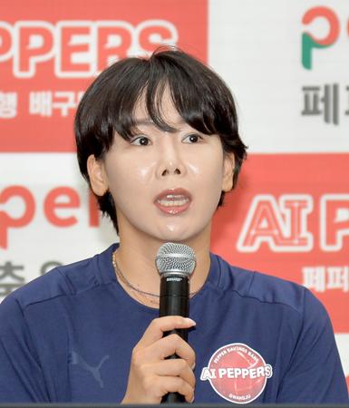 지난해 7월 19일 오전 광주 서구 광주시체육회관 중회의실에서 열린 페퍼저축은행 배구단 AI페퍼스 미디어데이에서 오지영이 포부를 밝히고 있다. 2023.07.19.