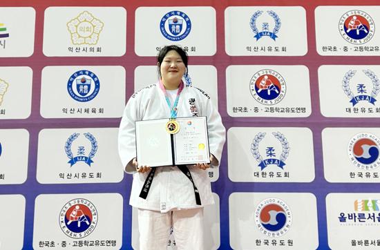24일 광주체육중에 따르면 여자중등부 +70kg 김하은 선수는 대회 4일째 1회전부터 결승까지 화려한 기술로 상대 선수를 압도했다. 준결승에서 용운중 이서하 선수를 업어치기중, 되치기 전반과 누르기 한판승으로 결승에 진출했다. 경기체육중 최보민 선수와 결승전에서 안다리기술로 절반을 얻어 판정승으로 우승을 차지했다.