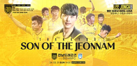 전남드래곤즈는 오는 31일 오후 2시 광양축구전용구장에서 K리그2 2024 4라운드 천안과의 홈경기를 치른다. 이날 전남은 광양루니 이종호를 초청하여 선수단 격려와 팬 사인회 그리고 은퇴식을 진행한다고 밝혔다.