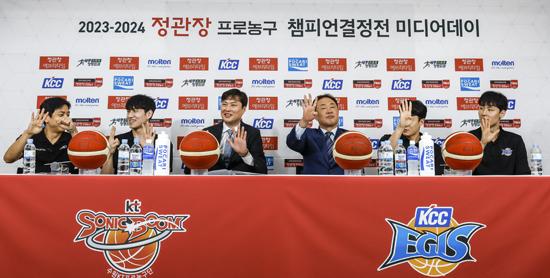25일 오전 11시 서울 강남구 KBL센터에서 열린 \'2023~2024 정관장 프로농구\' 챔피언결정전 미디어데이에서 송영진 KT 감독과 전창진 KCC 감독, 양 팀 선수들은 챔피언결정전에 임하는 각오를 밝혔다.