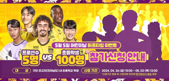 전남드래곤즈가 5월 5일 어린이날 홈경기 맞아 하프타임 이벤트인 프로선수 5명 vs 어린이 100명 축구대결을 진행하며 함께할 어린이 참가자를 모집한다.