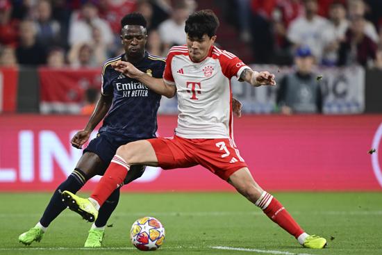 바이에른 뮌헨(독일)의 김민재가 지난달 30일(현지시각) 독일 뮌헨의 알리안츠 아레나에서 열린 2023-24 유럽축구연맹(UEFA) 챔피언스리그(UCL) 준결승 1차전 레알 마드리드(스페인)와 경기 중 공을 다투고 있다. 김민재는 풀타임을 소화했으나 동점 골의 빌미를 제공하면서 뮌헨은 2-2 무승부를 기록했다. 2024.05.01.