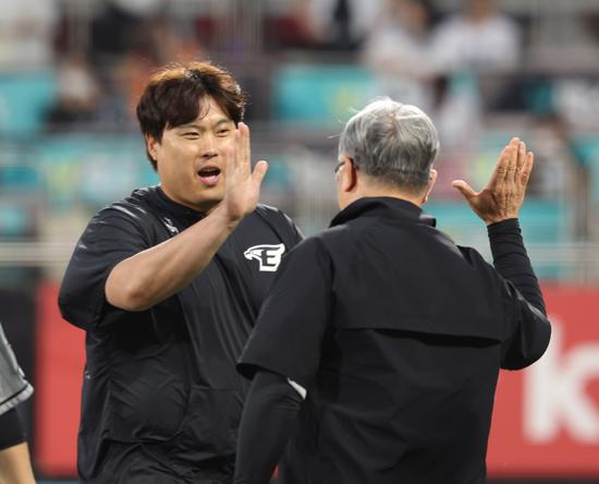 6일 오후 경기 수원시 수원KT위즈파크에서 열린 2024 KBO리그 한화 이글스와 kt wiz의 경기, 6-0으로 승리한 한화 류현진이 김경문 감독과 인사하고 있다. 2024.06.06.